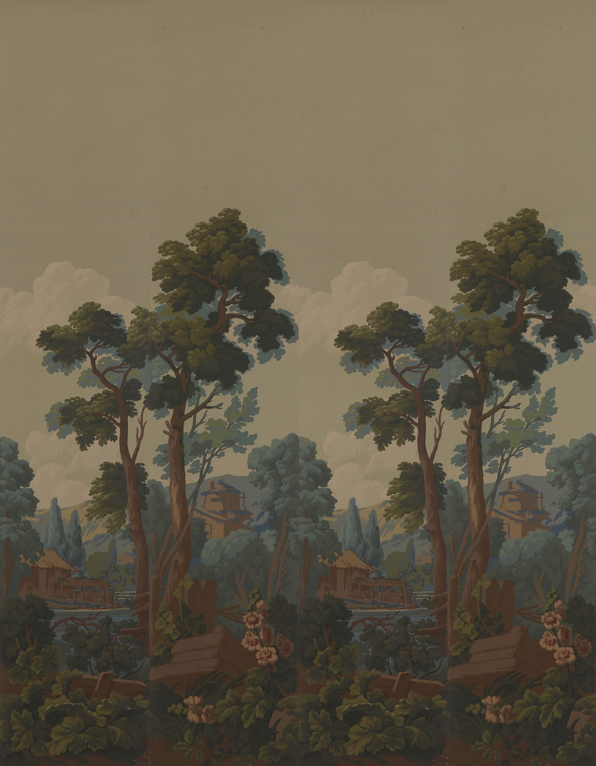 A rare Zuber early 20th-century coloring for this classic formal garden landscape, in sepia on a shaded blue sky. Five strips #4, #5, #6, #1, #2 (first strip joins with the last) each 18 in. wide, 12 ft. long, highest part of design 4 ft. 5 in., mint condition..