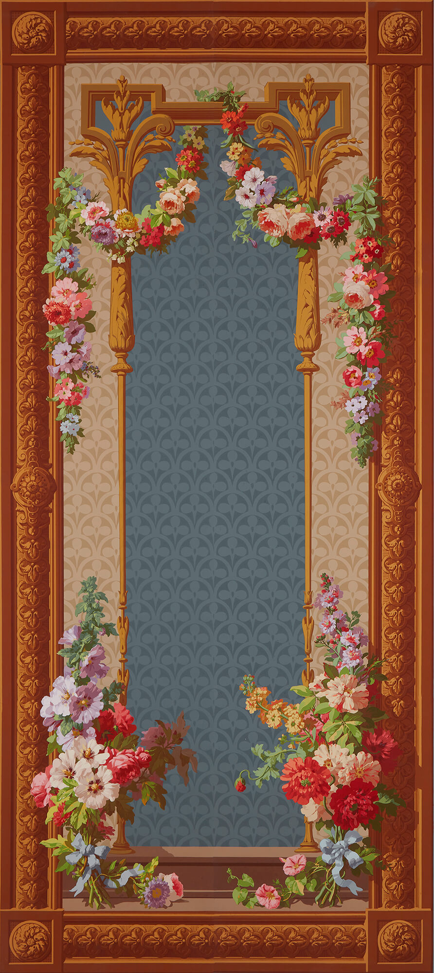 The panel is made up of five strips with the trompe l’oiel border printed on each strip. The overall height of the panel is approximately 8 ft. 4 in, and the panel covers approximately 12 ft. 6 5/8 in of wall. Additional strips available.